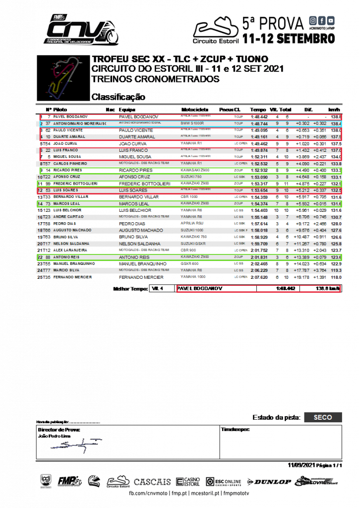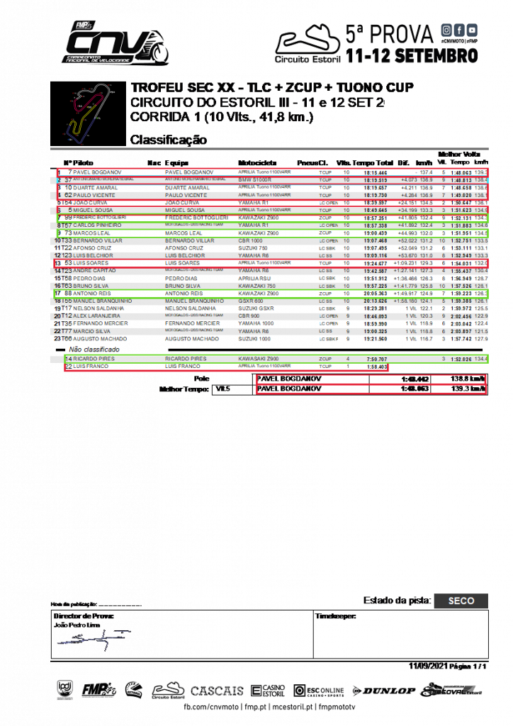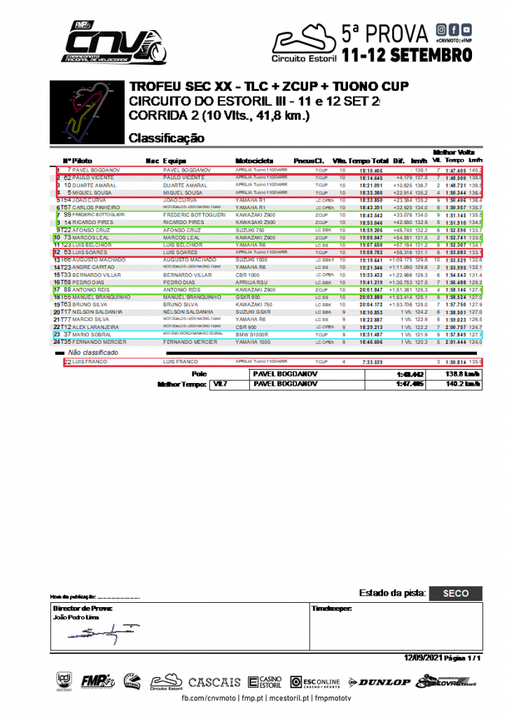 Atrás de Bottoglieri, termina a Z de Pires, entretanto já recuperada do azar anterior, conseguindo também este rodar no segundo 51!! Está tudo muito rápido!! Um pouco mais atrás, vem a Z de Leal, depois de ambos perderem a Tuono de Franco à saída da parabólica, interrompendo assim prematuramente, a recuperação que vinha a fazer depois de uma partida menos conseguida. Uma queda, felizmente sem consequências físicas de maior e com poucos danos na motita. Um fim-de-semana que não correu bem para o simpático piloto. Enfim, há dias assim. Siga para a próxima! Um lugar atrás da Z de Leal, fica a Tuono de Soares que foi, paulatinamente, subindo posições ao rodar várias vezes no segundo 53 e ficando somente a cerca de 1s da quarta TLC mais rápida em pista! Muito bom!! Reis na Z #88 fecha a classificação da Zcup depois de uma corrida tranquila. Já menos tranquila terá sido a corrida de Mário Sobral, neste regresso às lides 20 anos depois, numa moto desconhecida, sem estar habituado à caixa invertida e partindo “lá de trás”. Lá se consegue descontrair depois de ser dobrado pelos líderes, rodando em 1:57,849 na última volta, aproveitando para desfrutar da oportunidade de fazer aquilo que muito gosta, no sítio certo, em boas condições, cumprindo com os objectivos traçados para esta participação. A repetir!