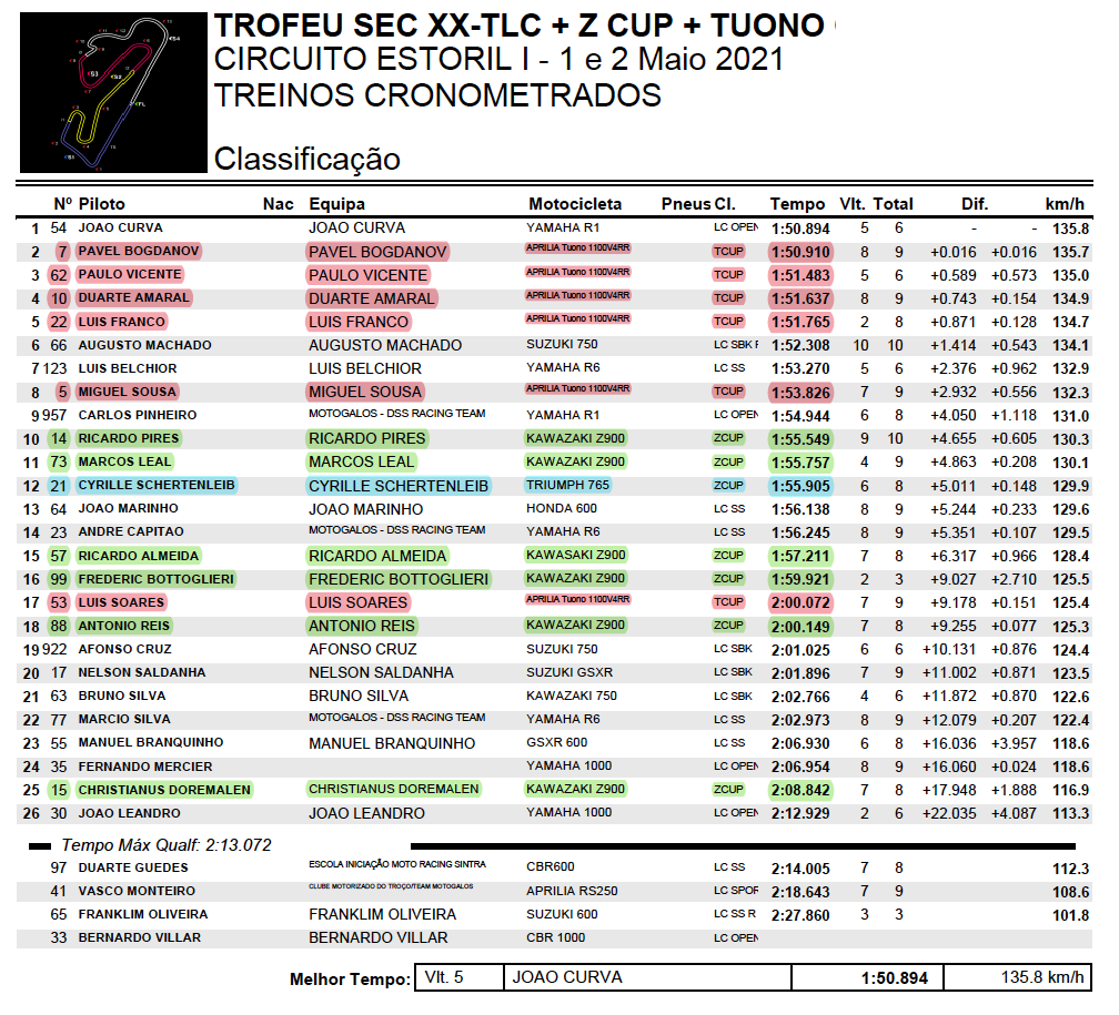 Com uma meteorologia boa para a modalidade, apesar de algo fria e ventosa, os pilotos TNB estiveram em destaque nos tempos, com as Tuono de Bogdanov e Vicente, a partilharem a linha da frente com João Curva das TLC Open que fez a pole à geral e determinou o tempo máximo de qualificação que impediu 4 pilotos de se qualificarem para as corridas de sábado e Domingo. Felizmente todos os participantes dos TNB registaram tempos dentro do limite, e para além das já mencionadas Tuono de Bogdanov (único das Tuono no segundo 50) e Vicente, as Tuono de Amaral e Franco lideraram a 2ª linha partilhada com Augusto Machado das TLC SBK.