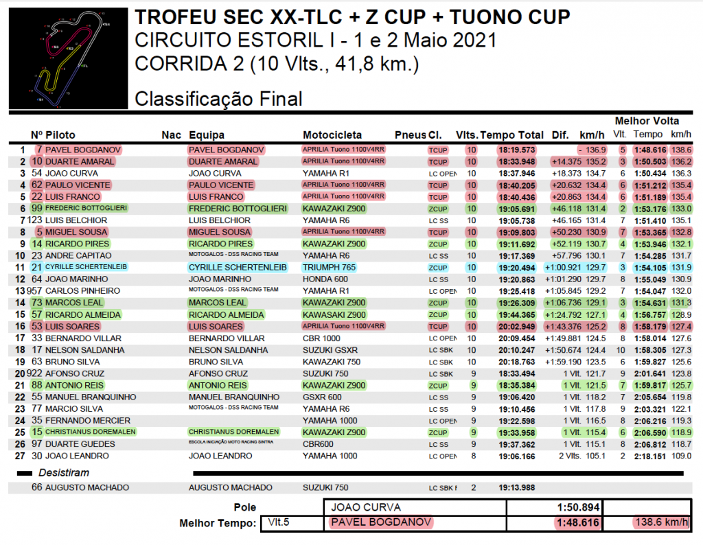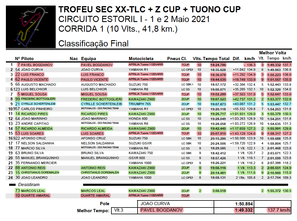 Na volta seguinte, Amaral espreme a Tuono até ao segundo 50, mas tal não é suficiente para segurar Bogdanov que, ao baixar ao segundo 49, mostra que este fim-de-semana é dele e de mais ninguém. A partir daqui, Bogdanov impõem um ritmo avassalador rodando consistentemente no segundo 49, com umas incursões ao segundo 48, ganhando a corrida com autoridade, deixando o 2º a mais de 14 segundos e chegando inclusive a bater o anterior recorde das Tuono no Estoril, pertença de Miguel Vilares, fixando-o agora em 1:48,616. Fantástico!!